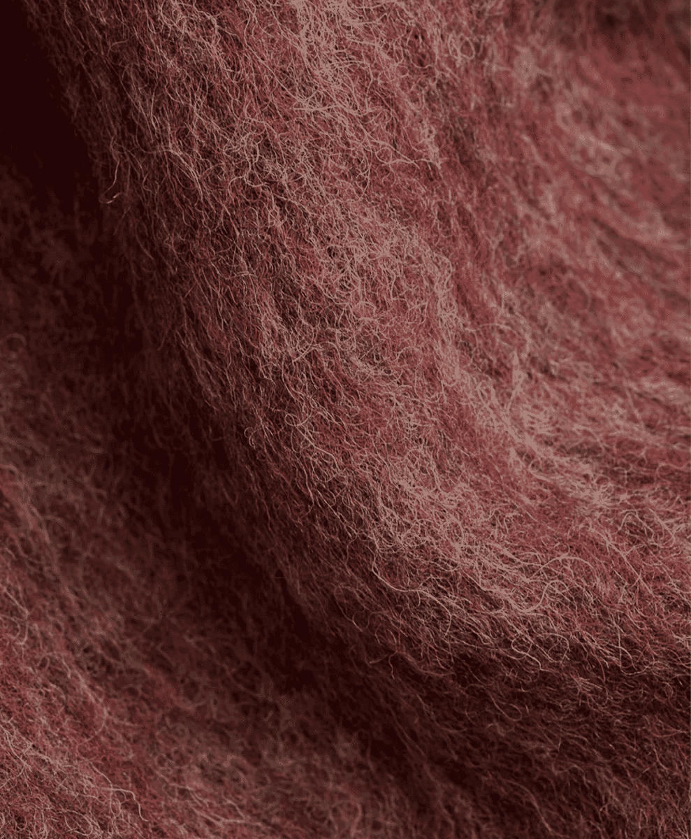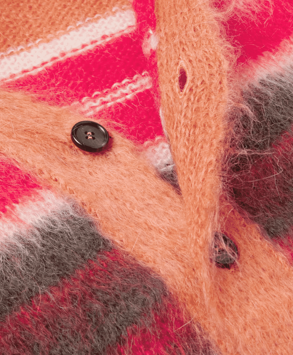 Mohair fibres are long and silky, allowing them to be spun into lightweight yet incredibly warm yarns with a unique ‘hairy’ texture. The fibre’s natural lustre gives it a slight shimmer, making it perfect for creating stand-out garments like fuzzy cardigans. It takes dye like a dream too, which is why you’ll often find mohair cardigans finished in vibrant colours, striking patterns and bizarre geometric prints.