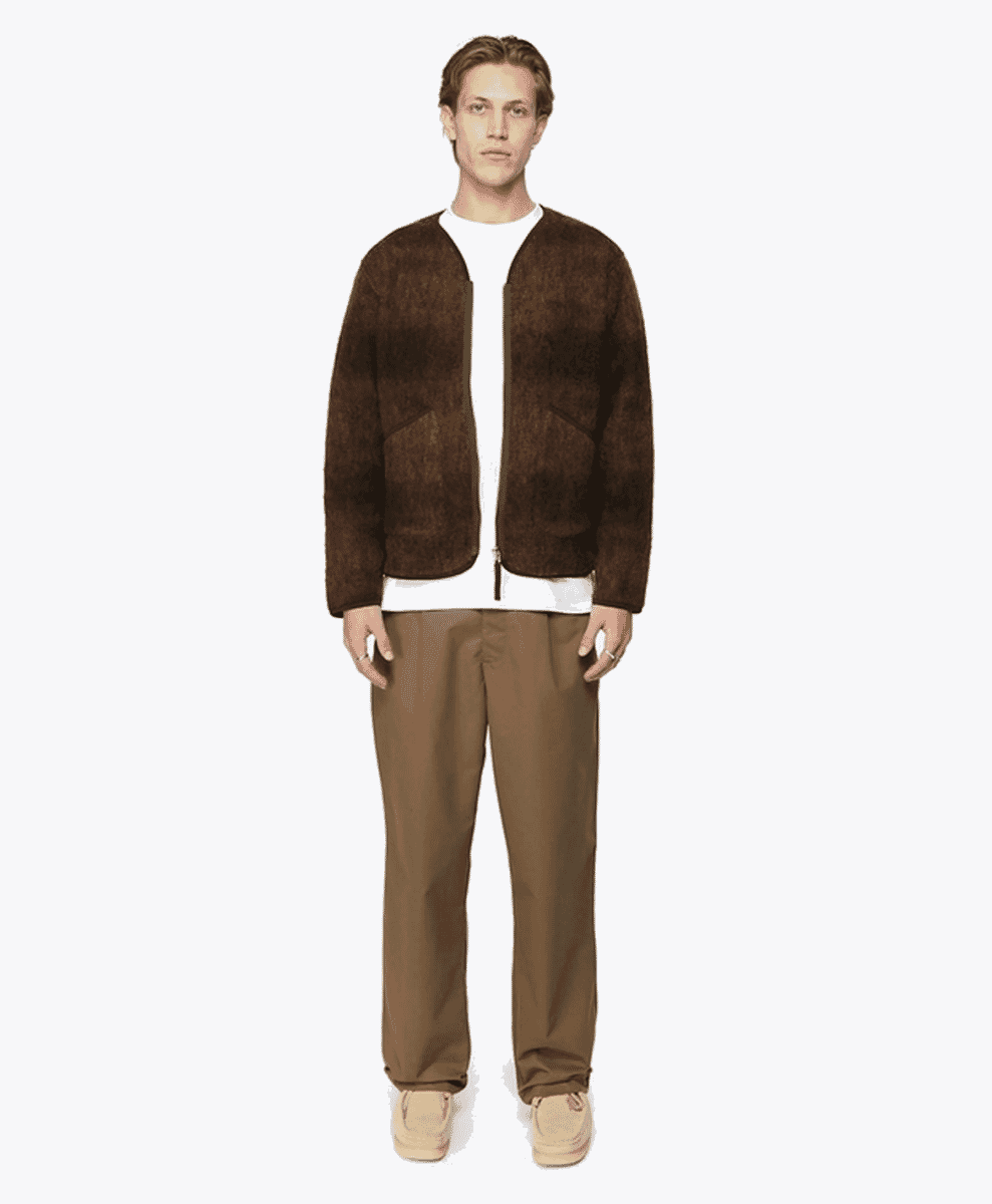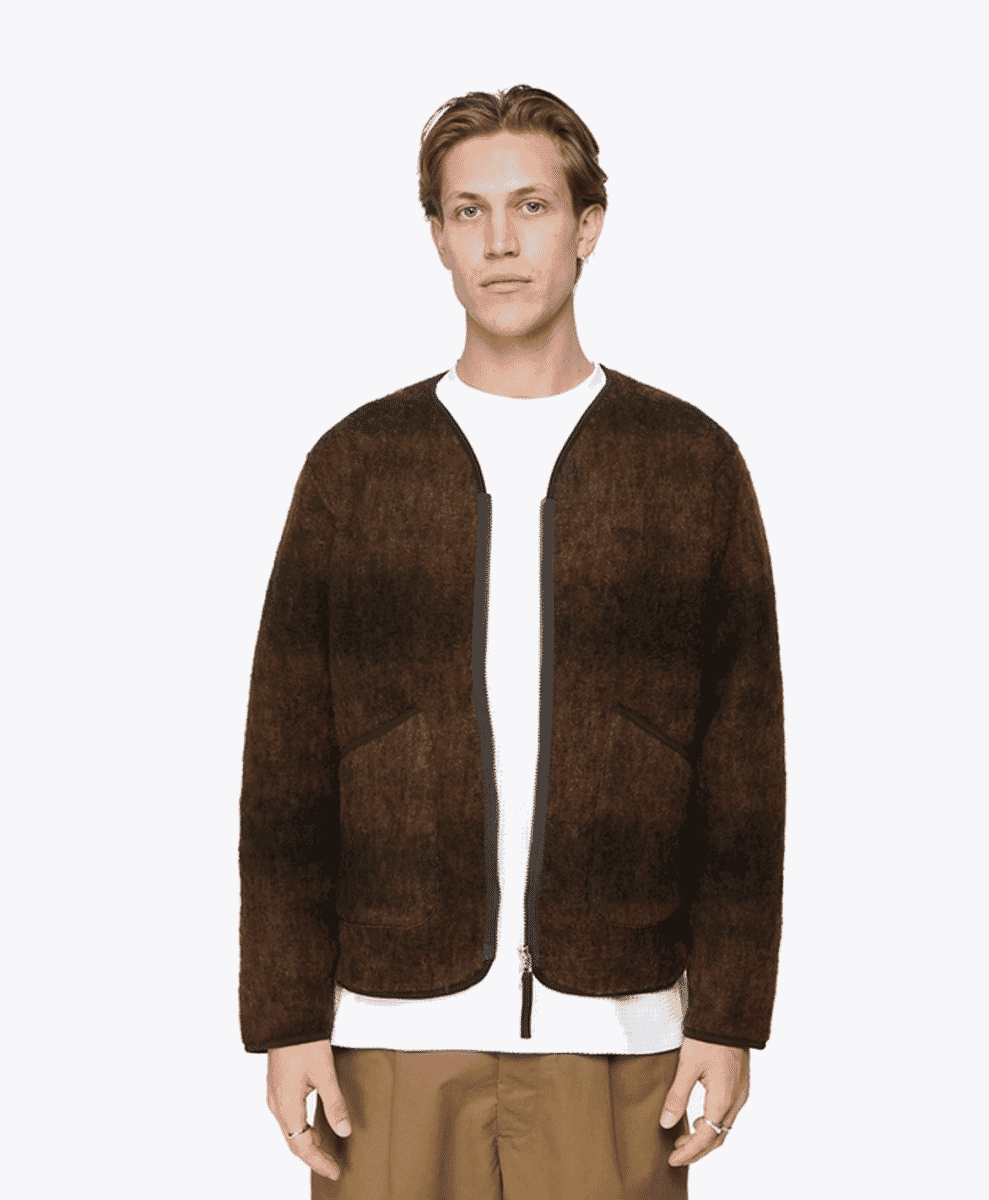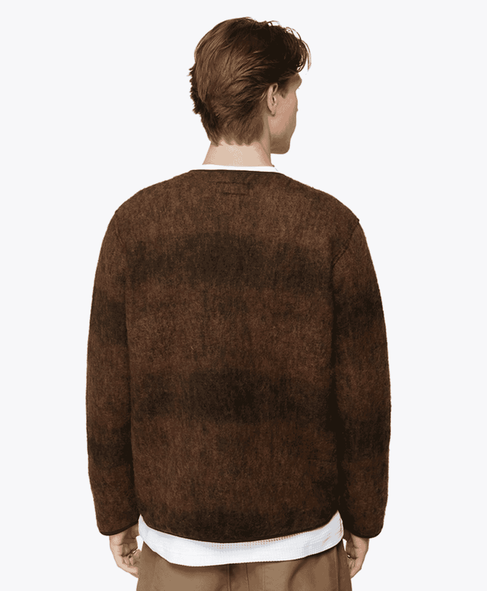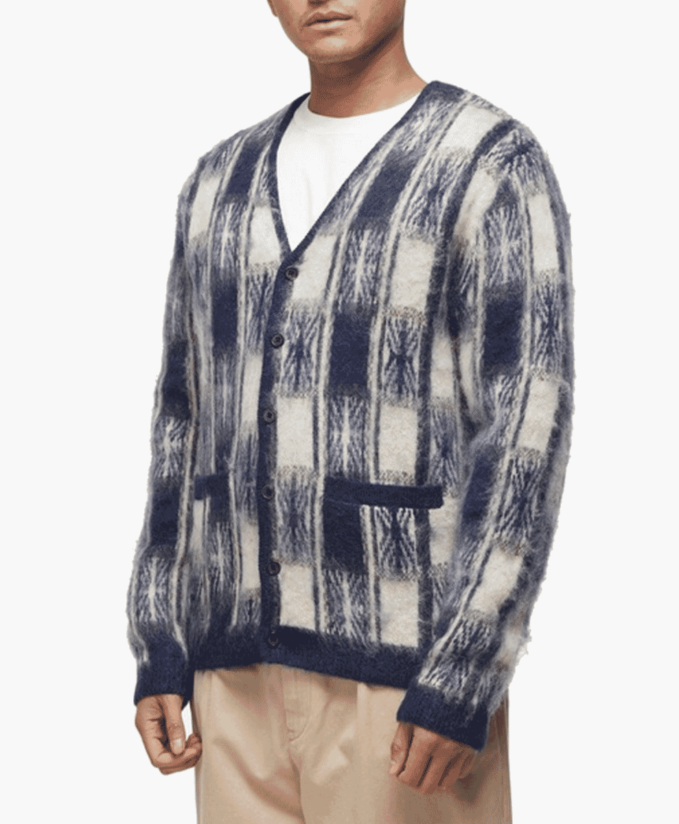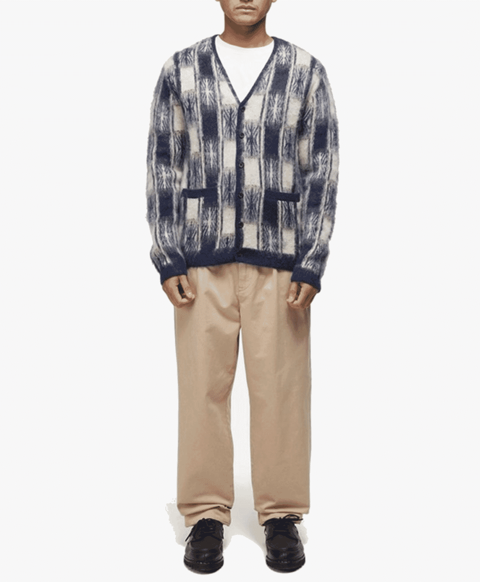 Universal Works brings a more practical, workwear-inspired approach to its knitwear. These fuzzy cardigans are typically simple, often available in neutral tones with minimal patterns. This British brand focuses on creating functional, long-lasting clothing, and its cardigans reflect this ethos.