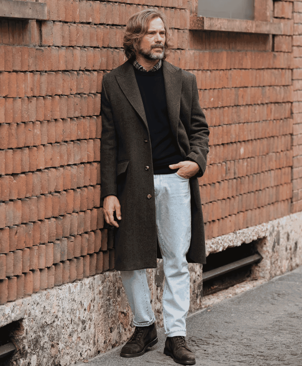 Denim and boots are natural allies. A raw or mid-weight selvedge jean works best, with a turn-up that shows off the shape of the boot rather than swallowing it. Avoid distressed or over-styled denim. The point is to look effortless.