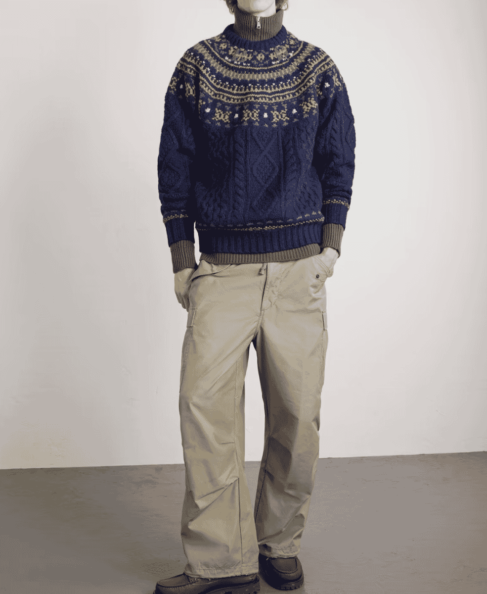 Japanese label Beams Plus puts a modern twist on classic menswear, and this Fair Isle jumper is no exception. Featuring a deep navy base with pops of green, yellow, and white, it nods to tradition without feeling overly festive. Finished with a textured cable knit pattern, it’s ideal for layering over an Oxford shirt for a smarter take on seasonal dressing.