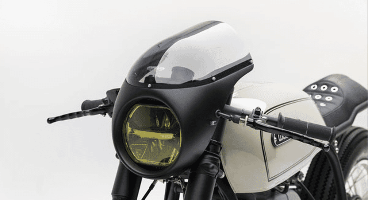 Rear ride is provided by YSS Suspension Sidewinder while front shock absorbers boast new springs and other internal parts. Eighteen-inch spoked wheels are fitted with hefty front brake discs and rear drum brake ensuring you’ll stop as fast as this newly lightweight machine accelerates. Neat faring, finished in matte black, is taken from a Harley Davidson. Control panel is - naturally - minimal featuring Motogadget speedometer, Daytona grips and KustomTech levers.