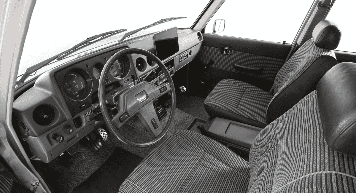 You’ll open the door to a world of the 1980s. Tough-talking seats are in put-up-with-anything grey striped cloth. All-original instrument cluster is as the FJ60 was when brand new, "giving the impression,” say Toyota that "it could have spent the past 40 years tucked away in a garage, aging gracefully yet refreshed for today”. You’ll be relieved to know that there’s some digital additions, including a high-end JBL stereo system for your off-road soundtrack.